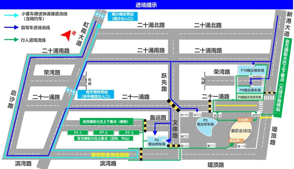 广州方向自驾观众:建议由南沙港快速新龙收费站下高速(或由灵新大道),经新港大道前往P9、P10停车场停放,沿行人通道步行前往北验票口。