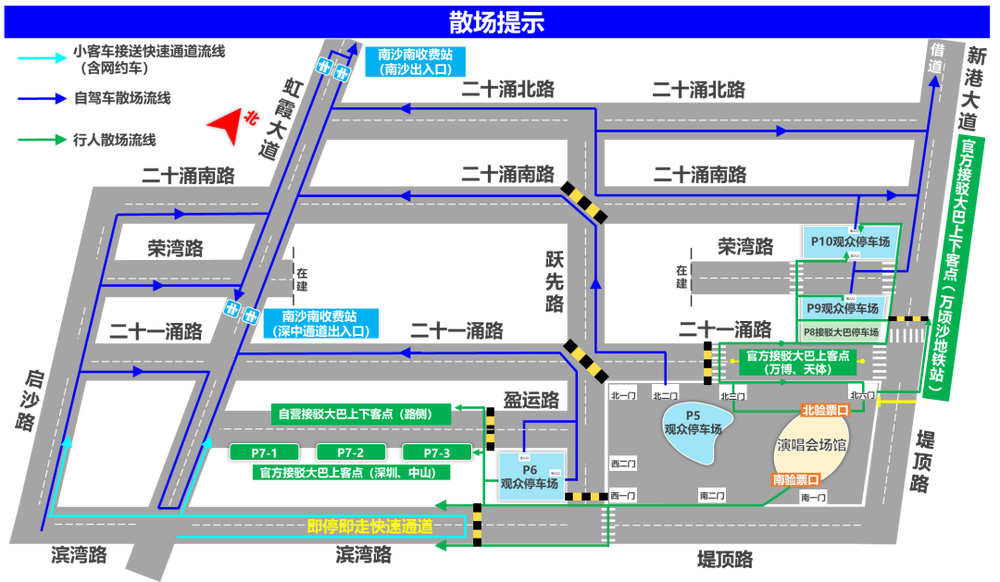 二十一涌路(北二门-北六门)、盈运路(虹霞大道-P6停车场出入口)仅供接驳大巴进入;文体路(P6停车场出入口-西一门)、滨湾路(A线摆渡车5号接驳点-西一门)、新港大道(北往南掉头口-二十一涌路)以上路段交通管制,禁止车辆通行;虹霞大道、新港大道、滨湾路等路段将实施动态交通管制;其中,演出日8时起,将对管制路段违停车辆进行清理,其余路段根据实际车流情况引导有序通行或路侧停放,违者拖移。