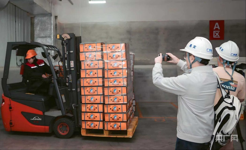 走进广州南沙国际物流中心,园区内呈现出一派繁忙景象,叉车工人正有序地将泰国香水椰青等进口生鲜商品装载到货车上。