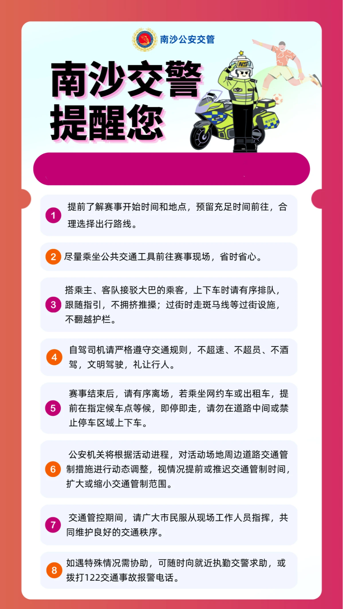 虹霞大道、新港大道、滨湾路等路段将实施动态交通管控。比赛当天8:00起,将对管控路段违停车辆进行清理,其余路段根据实际车流情况引导有序通行或路侧停放,违者拖移。