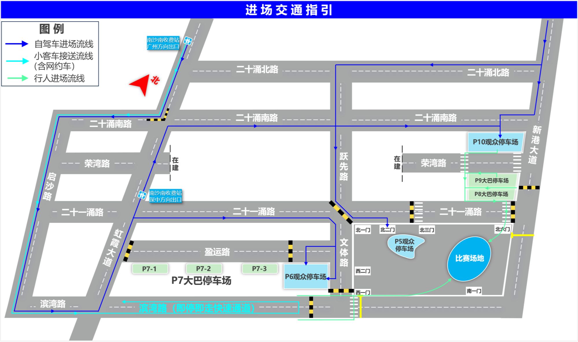建议由南沙南收费站下高速,经启沙路出虹霞大道后前往P5、P6停车场停放,或由新龙收费站下高速,经新港大道、二十涌南路前往P10停车场停放后,沿行人通道前往比赛场地。