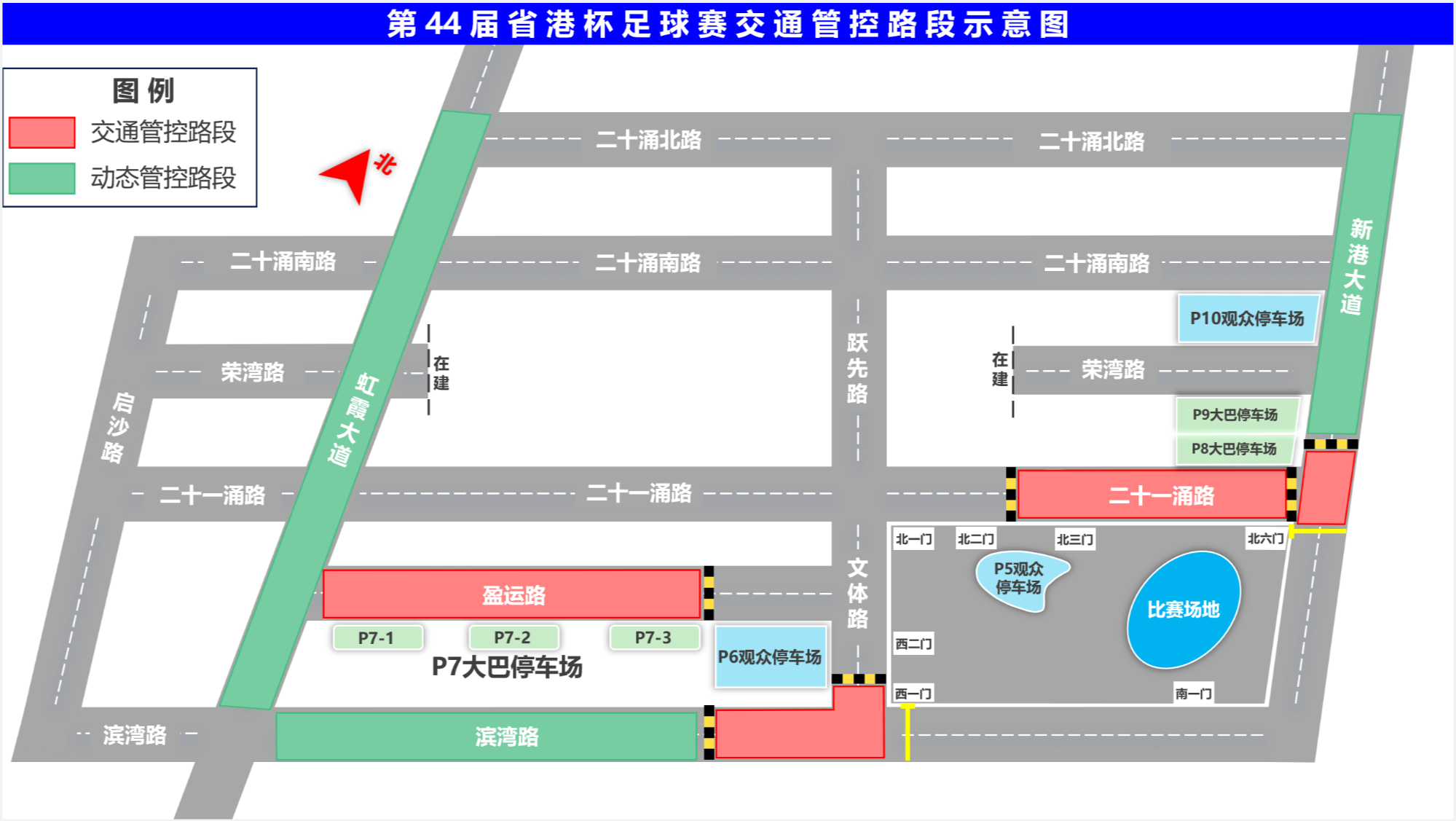 二十一涌路(北二门—北六门)、盈运路(虹霞大道—P6停车场出入口)、文体路(P6停车场出入口—滨湾路)、滨湾路(西一门以西100米路段)、新港大道(北往南掉头口—二十一涌路)以上路段交通管控,禁止车辆通行。