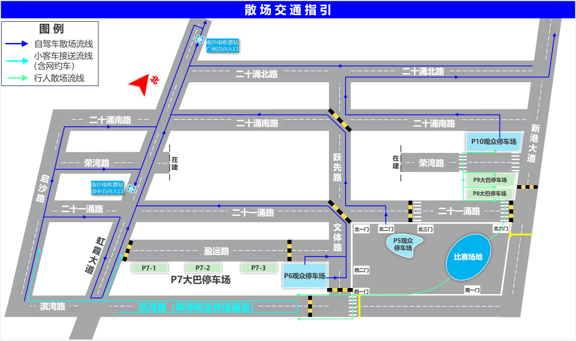 车辆停放P10停车场的观众,建议经二十涌南路—跃先路—二十涌北路—新港大道驶离;车辆停放P5停车场的观众,建议经跃先路—二十涌南路—虹霞大道驶离;车辆停放P6停车场的观众,建议经文体路—二十一涌路—虹霞大道驶离。