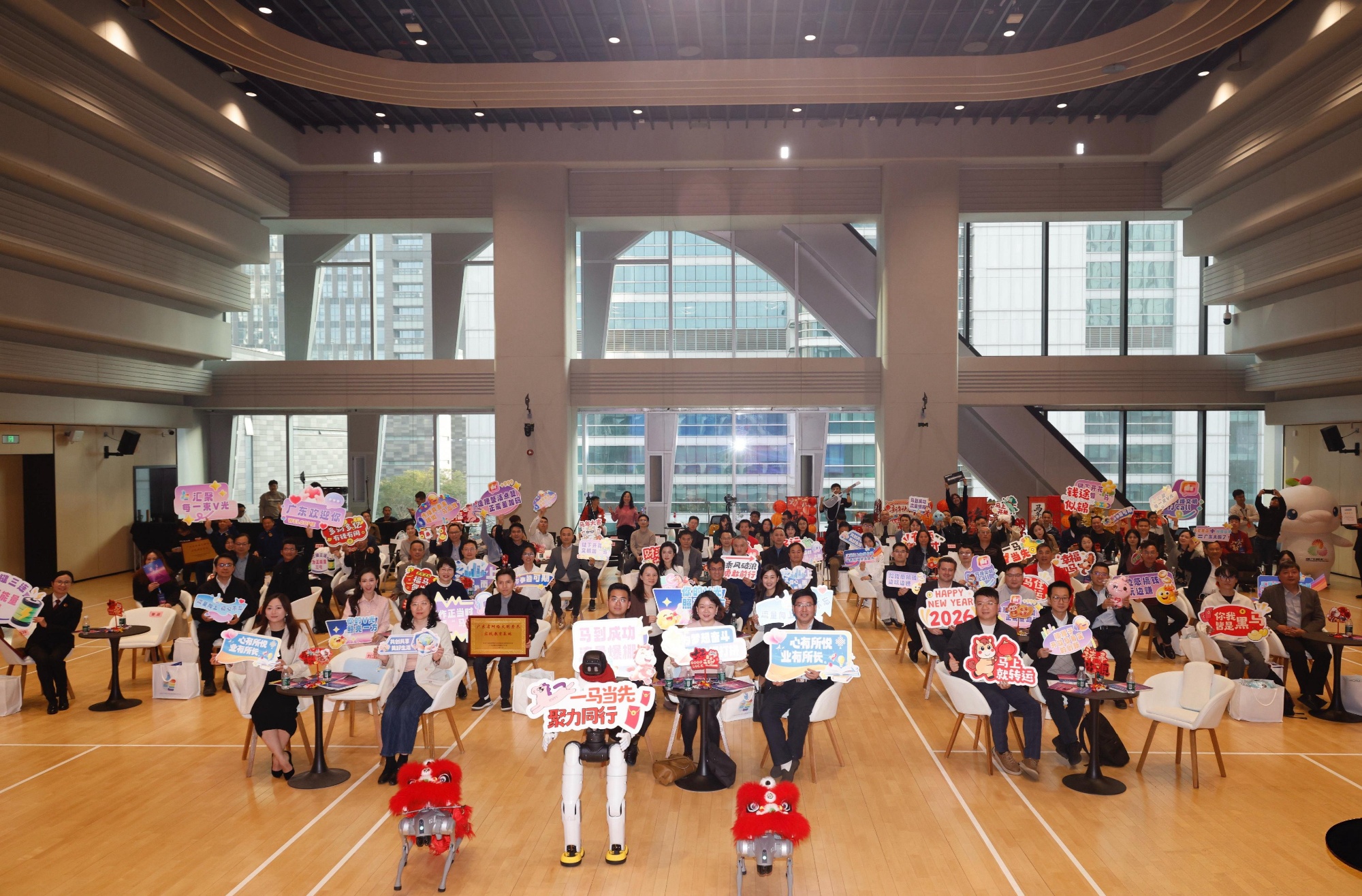 场间,省级非遗“洪拳小子贺新春”虎虎生风,海珠区官洲街黄飞鸿洪拳武术队展现传统之力;机器狗穿行送福,机器人灵动互动,未来感十足。