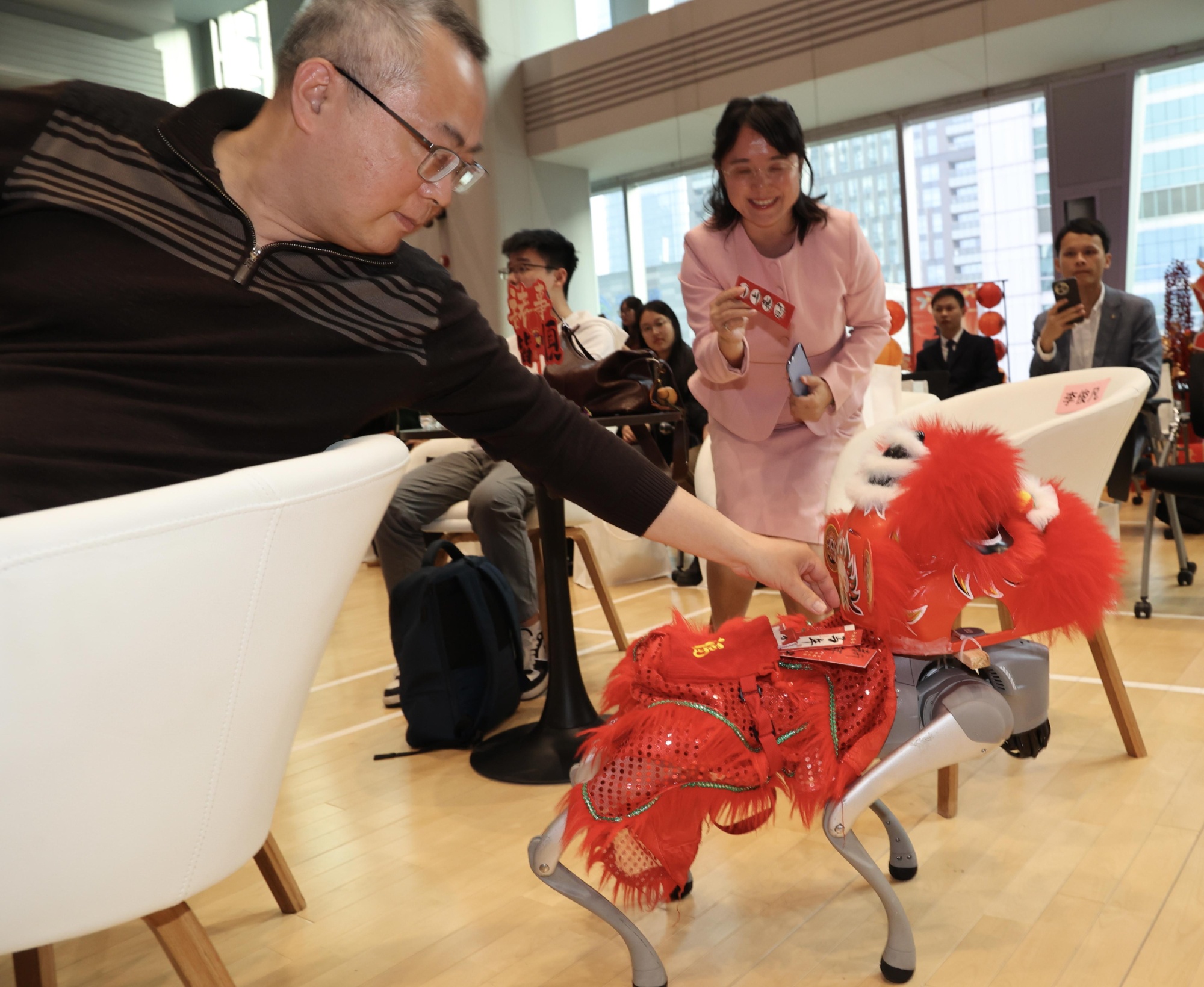 活动现场,来宾与机器狗欢乐互动