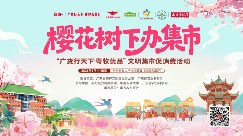 这份深耕产业的坚韧力量,化作惠民好物走进万家。3月14日至15日,“广货行天下·粤牧优品”文明集市促消费活动将在华南农业大学盛大启幕。该活动由广东省精神文明建设办公室、广东省农业农村厅联合指导,南方报业传媒集团、华南农业大学、广东省农业科学院主办,温氏股份、壹号食品、天农集团等企业特别支持,以“樱花树下办集市·粤牧优品惠万家”为主题,落地竹铭草海、第一教学楼、红满堂三大片区,邀您在春日踏青赏花的美好时光里,近距离品鉴粤牧优品,感受岭南畜牧产业的发展成果,领略岭南畜牧文化的独特魅力,一同遇见粤牧产业的温柔与硬核。