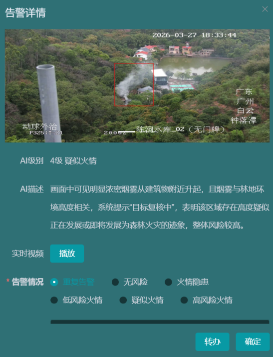 面对海量监控画面,人工盯守费时费力、易漏看错看。平台创新采用“前端快速识别+后台精准研判”双重AI模式,毫秒级捕捉烟雾、火苗,智能区分炊烟、雾气与真实火情,自动分级预警,让防火更聪明、更可靠。