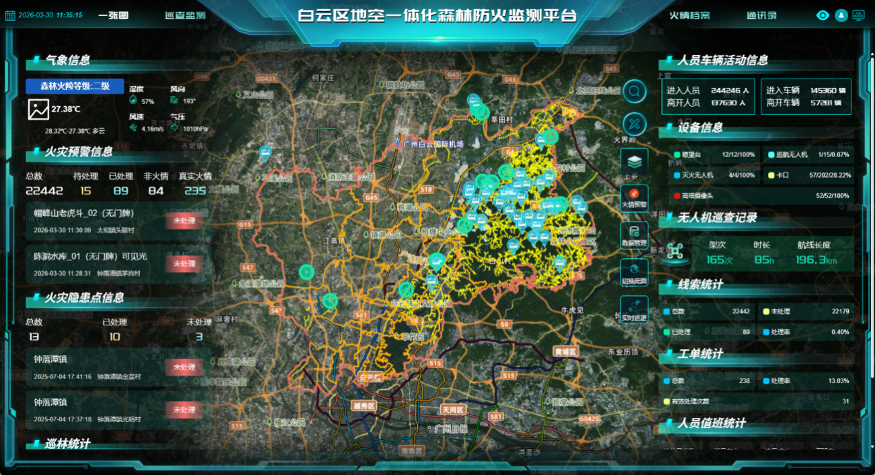 白云区森林覆盖率超25%,山林与城区交错相连,清明祭扫、农事活动、踏青出游都带来不小的防火压力。过去靠护林员徒步巡查,难免有覆盖不到的死角,发现隐患慢、联动处置不及时。