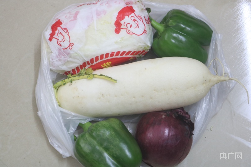 免费蔬菜包中,包含一棵黄心菜、一根白萝卜、两个菜椒和一个洋葱(央广网记者 夏燕 摄)