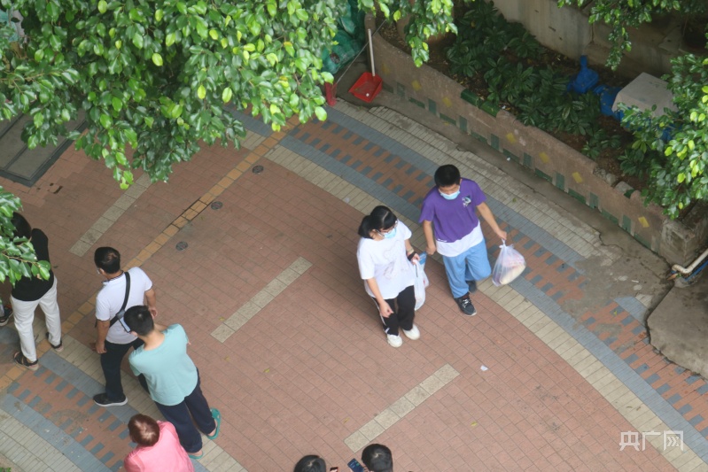 荔湾区的管控区域内,居民有序排队领取免费蔬菜包(央广网记者 夏燕 摄)