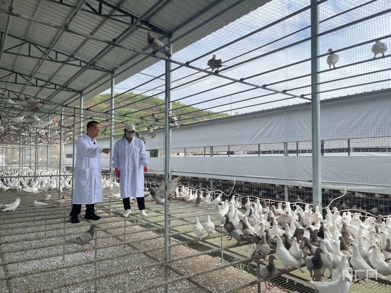 在兴宁市龙田镇羊岭村肉鸽养殖基地,工作人员正在查看鸽群生长情况(央广网记者 张顺鹏 摄)