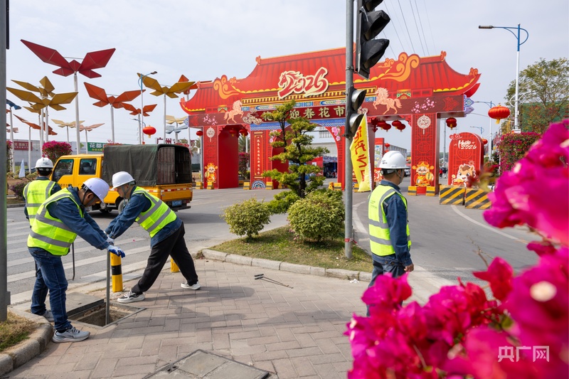 工作人员在迎春花市周边检查供水设施(央广网发 受访者供图)