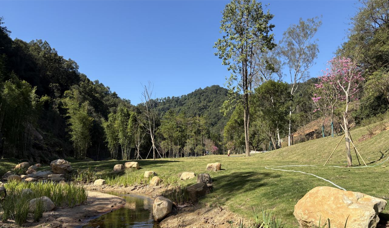 花都规资分局坚持“规划先行、因地制宜”原则,组织专业技术团队深入踏勘,在充分尊重自然肌理的前提下,科学布局景观节点。一条10.5公里的森林步道蜿蜒穿行,将分散的生态资源串珠成链。步道建设坚持“低干预”理念,就地取材、依山就势,既满足徒步休闲需求,又最大限度保护原生风貌。沿途视线开阔处,新增的观景平台与休憩设施错落有致,让游客在登高望远间感受森林四季。山谷深处,一处亲水活动场地成为点睛之笔——通过生态驳岸修复、水系梳理和乡土植物点缀,原本平淡的溪流重获生机,共同营造出自然野趣的生态空间。林场道路沿线,两处生态节点同步完成提升,广场铺装、景观亭建设、植物配置相得益彰,形成简洁舒适的林间休憩环境。
