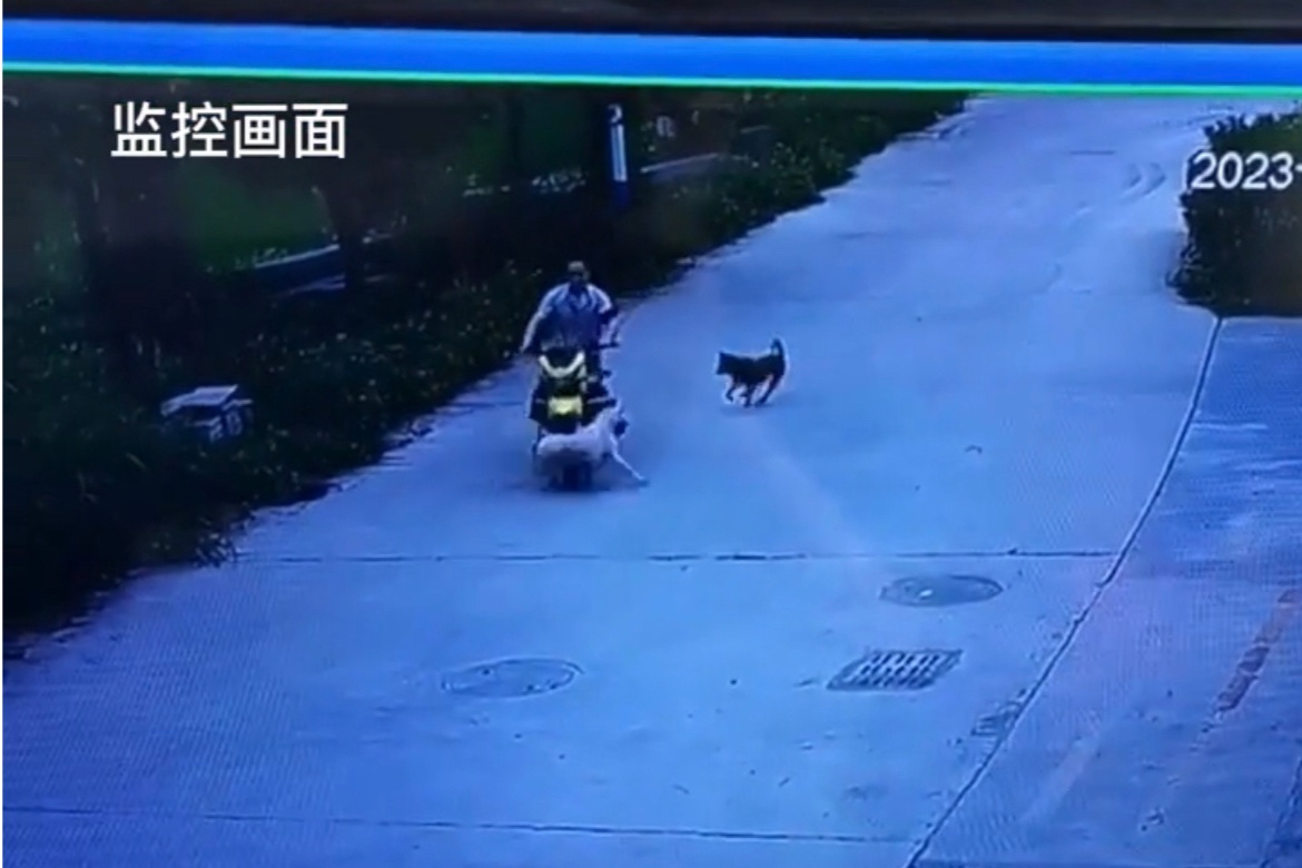 根据监控视频画面,一男子驾驶摩托车途中,突然从道路两侧窜出来多条狗,该男子不慎撞到其中一条长毛犬后,边驾驶摩托车边回头查看情况,感觉长毛犬无大碍后便离开现场。一小时后,犬主带着4名身穿治安服的治安员找到该男子讨要说法。监控视频显示,犬主多次掌掴该男子,并和治安队员一同对该男子进行围殴。