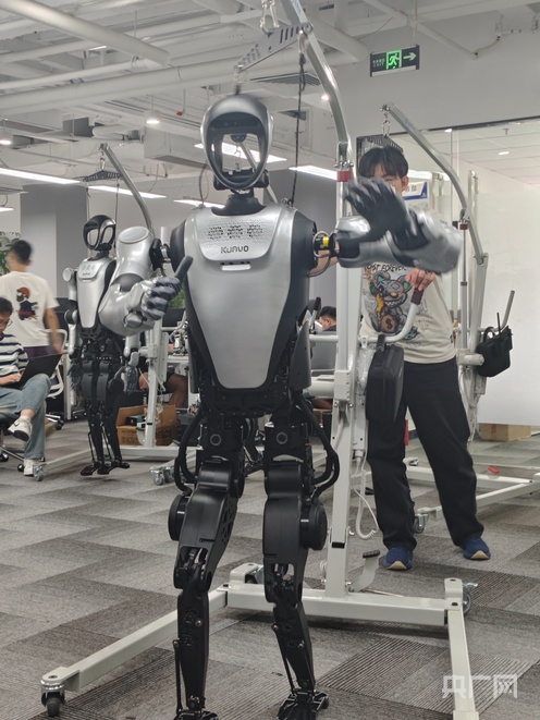在乐聚智能(深圳)股份有限公司的展厅,“夸父”人形机器人不仅能带领记者进入展厅、给记者递水,还在记者面前打起了太极。