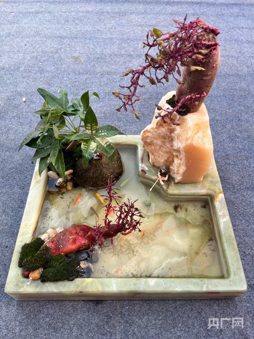 另一款石材水培景观更具巧思:浅色云石雕琢成内部不规则的水槽,新鲜番薯固定于凹槽中,紫红色茎蔓自然垂落,水槽内微型渔翁摆件与彩色鱼苗相映成趣,冷硬石材与鲜活绿植碰撞出独特美学张力,将“石都”工艺、花卉雅致与“薯乡”烟火气完美融合。