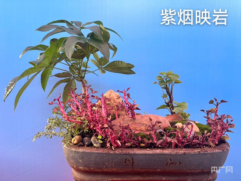 一款“紫烟映岩”组合盆栽,以天然石材为基底,巧妙搭配云城番薯苗与发财树,暗红透紫的番薯茎蔓缠绕石身,翠绿叶片层叠相映,底部苔藓与迷你石粒点缀其间,兼具石材的自然质感与作物的乡土生机。