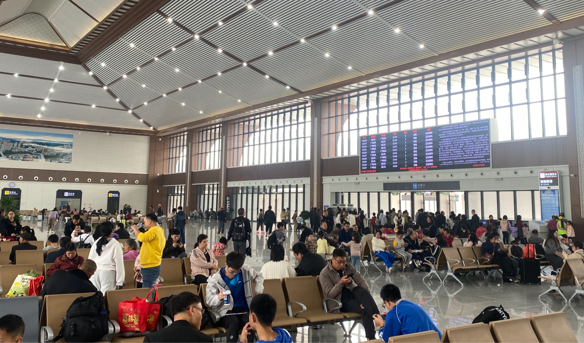 上午的候车大厅内,客流较平日明显增多。旅客在志愿者和工作人员的引导下有序候车,安检口虽排起队伍,但通行速度较快,广播循环播放着安全提示和车次信息,整体氛围忙而不乱。