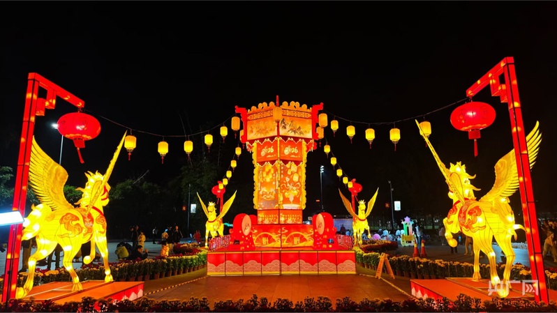 华灯初上,漫步兴宁,只见明珠体育广场上,四匹展翅天马花灯环绕主灯拱卫而立,“来兴宁上灯 添好运年年”的字样在夜色中格外醒目,与广场的开阔热闹相得益彰;祝枝山公园的花灯巧妙融入“一河两岸”景观,灯笼灯光摇曳,与河面波光、岸边树影交相辉映,恰如其分诠释了“来兴宁上灯 生活亮起来”的美好寓意;兴宁南站的花灯则大气简约,与站区空间相融,“兴宁上灯 ‘灯’您来”的温情邀约,让往来旅客刚抵兴宁,便邂逅浓浓客家年味。