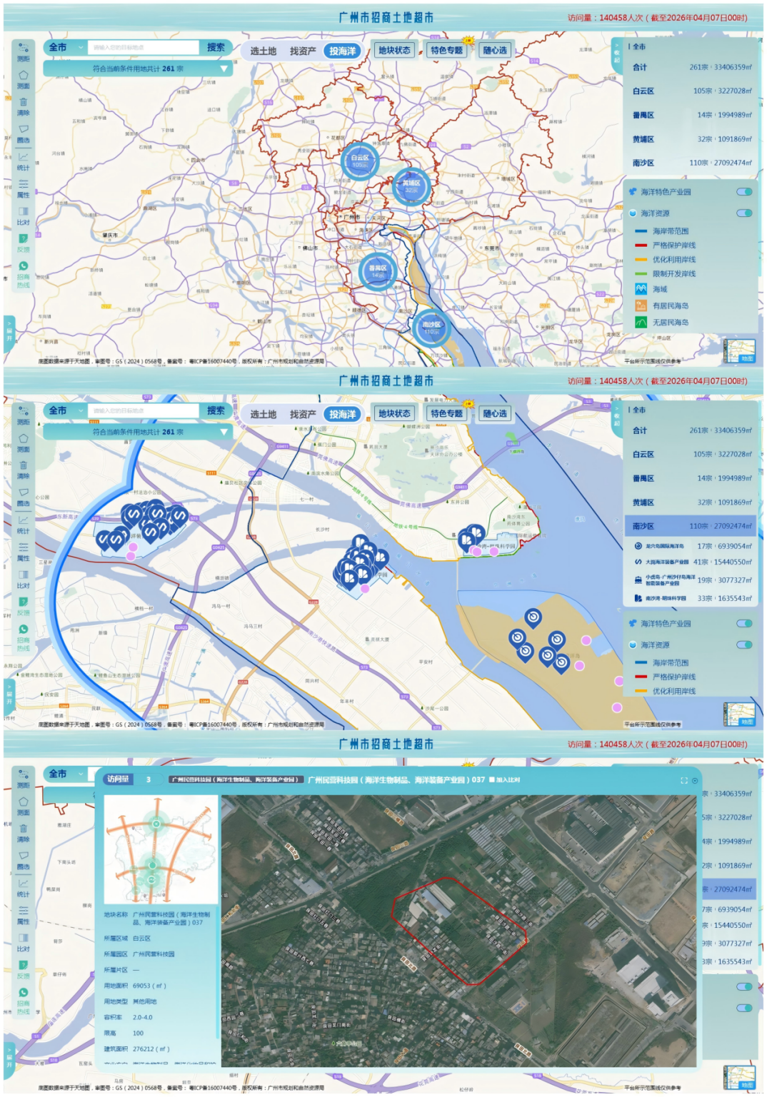 为持续深化要素市场化配置改革,广州市招商土地超市紧扣高质量发展主线,在“选土地”“找资产”双轨服务基础上,全新上线“投海洋”板块,首批展示213处可招商涉海资源,实现土地超市从“土地+资产”到“土地+资产+海洋”的全要素多维度拓展;同时新增“全域土地综合整治专题”,上线白云、花都、番禺、黄埔、南沙、从化、增城等七个行政区49个拟招商项目,助力城乡资源要素流通。