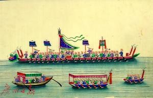 明清的广州“商贾辐辏,海船云集”,在外销通草画上得到详尽的记载。有轻巧的载客帆船,是水城广州居民出行的主要交通工具;有往返于狭窄河道之间的渡船、舢板,可载人和运输少量货物;有官员出行专用的官船,仿佛漂浮在水面的建筑;有因其圆形舱板和侧舷状如西瓜而得名的西瓜扁;还有兼具养殖及运输功能的鸭艇等,形象地描绘出一幅熙熙攘攘的珠江河上图。