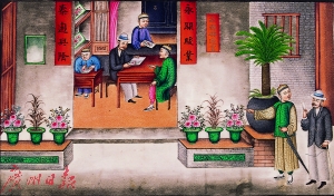 此外,广州市民王恒在世界各地收集通草画,先后向广州十三行博物馆赠送了500多幅,最近又向广州大元帅府赠送了逾百幅外销画,其中通草画就达40多幅。其中,有一幅通草画描绘了当年十三行行商所建花园中的“百花亭”园景。园中松柏垂柳,假山盆景,真实再现小巧别致岭南园林。小亭上还挂着一幅“松云窗外蔼,池水阁边明”篆书对联,成为寻找当年十三行行商花园真实记忆的重要参考物。