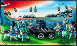 十三行新式救火场景,救火队员推水车。水车灯笼上写有“十三行”字样