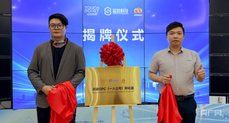 在与会嘉宾的共同见证下,三方代表王挺、陈阳、李燎原签署了共创协议。随后,点动科技代表王挺与蓝波科技代表陈阳一同登台,共同为点动OPC(一人公司)孵化器揭牌。