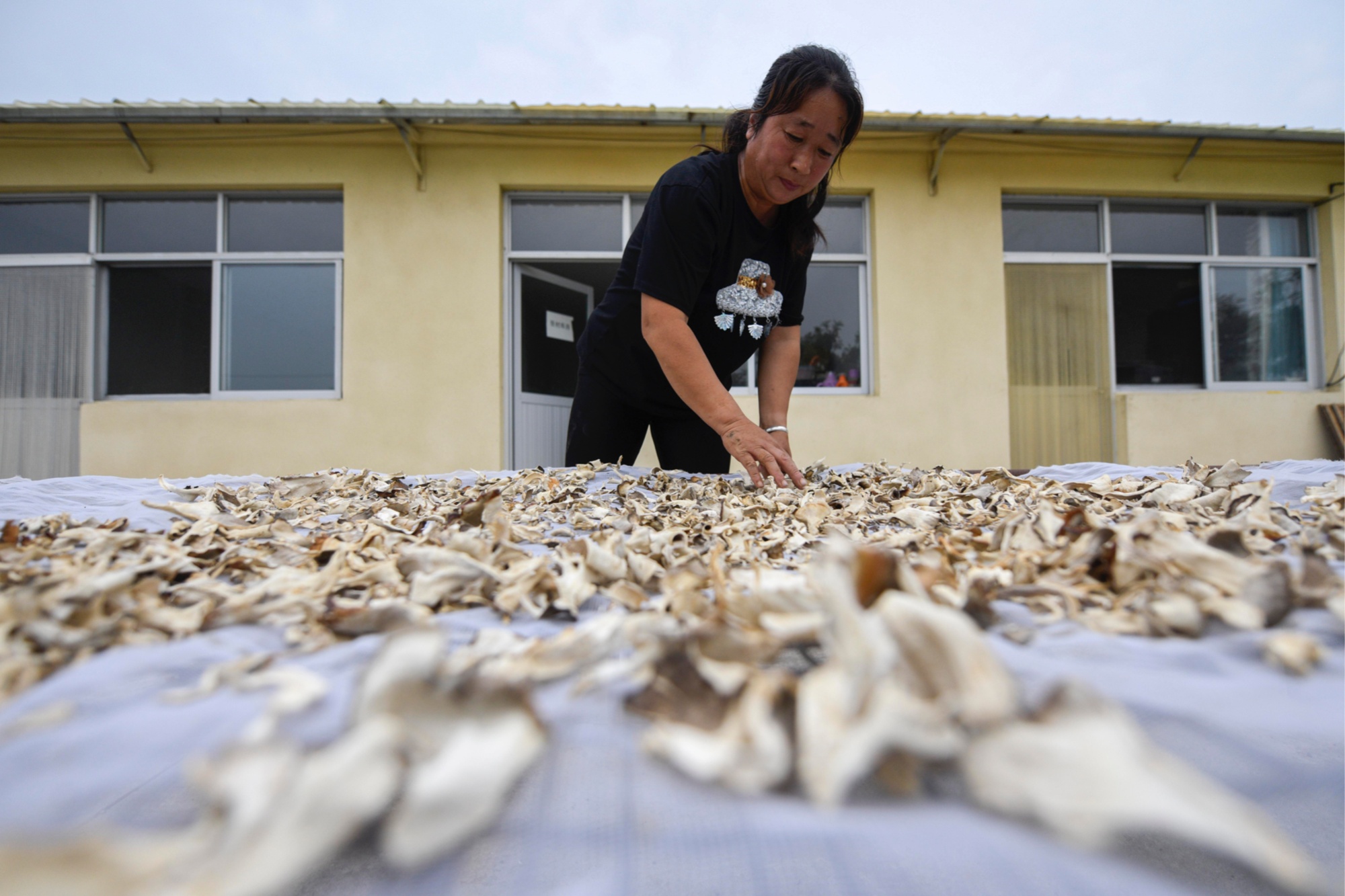 务工人员正在晾晒新鲜的栗蘑(王立群 摄)