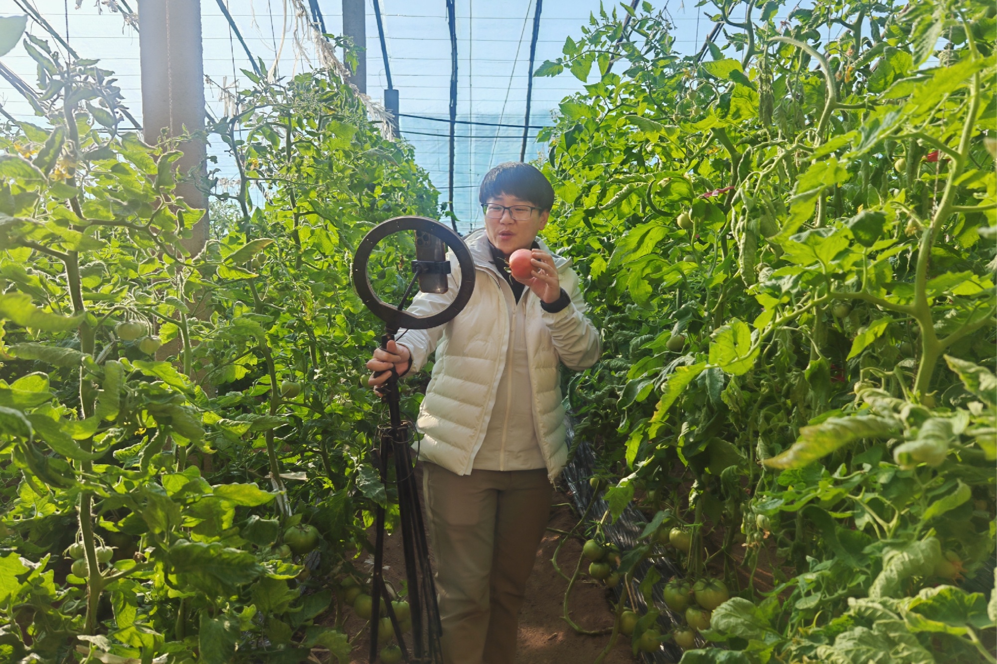 翟梦楠在西红柿大棚内直播(梁洁 摄)