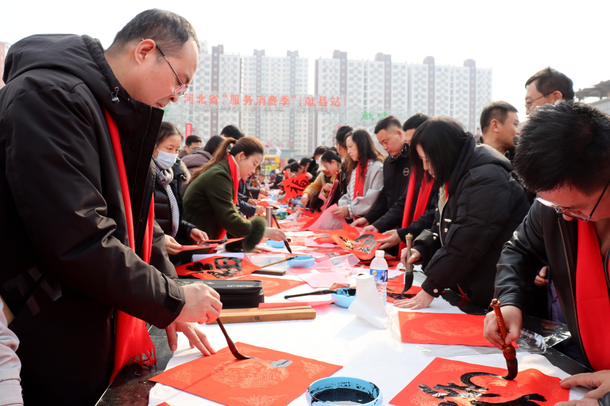 活动开笔后,多位书法名家现场挥毫泼墨、即兴创作,一幅幅寓意吉祥的红纸福字、一幅幅饱含深情的新春春联在笔尖流转而生,笔墨飘香间传递着浓浓的年味与人文温情。名家们还特意书写“四献”“四地”等彰显献县地域特色的主题内容,将地域文化与新春祝福巧妙融合。
