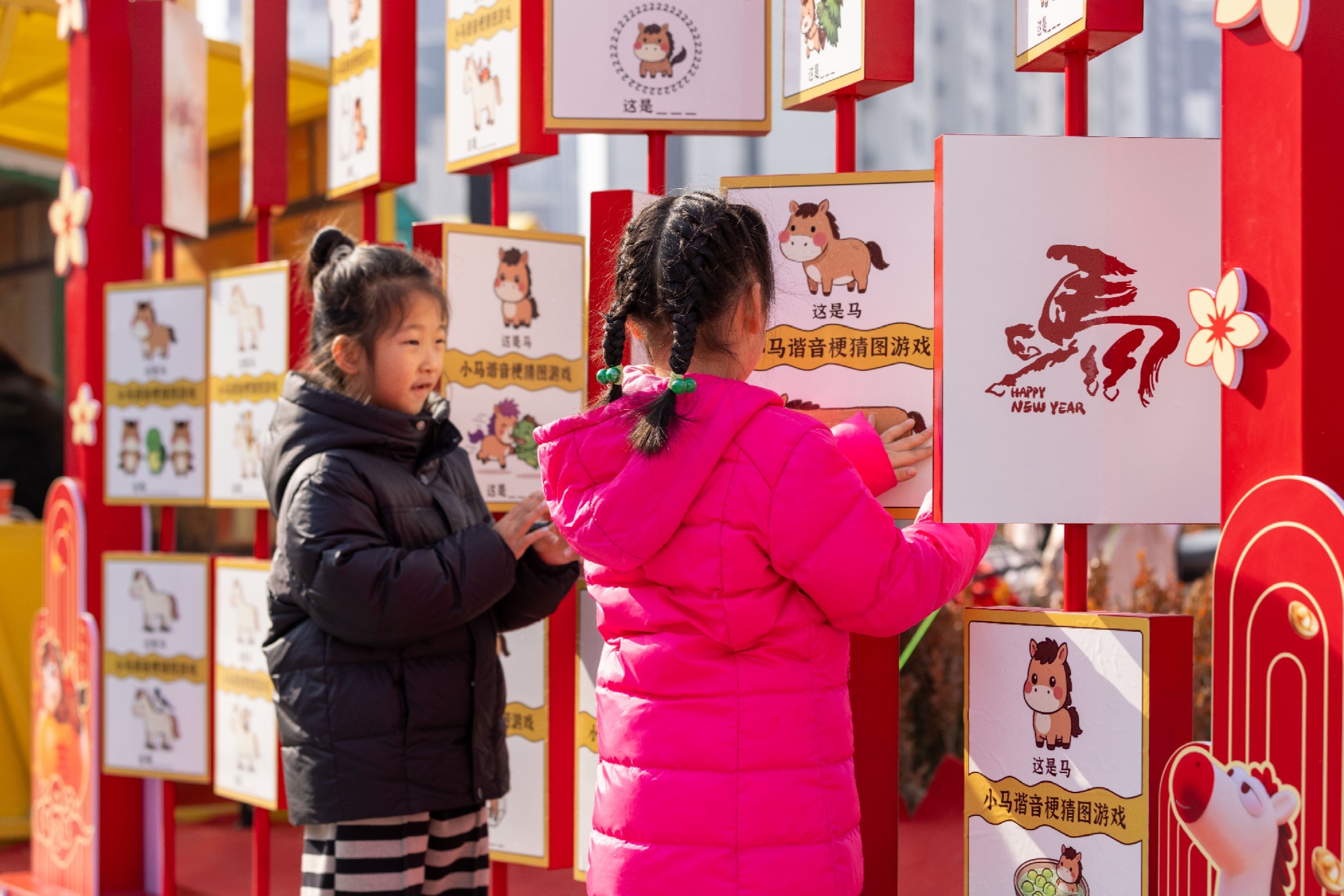 文化展演与娱乐区节目不断,舞狮、高跷热闹开场,民族舞《苍穹唤》、评剧《花为媒》等轮番上演。互动体验区内,40多名儿童在老师指导下体验剪纸、插花、绘制戏剧脸谱、书写春联等活动,亲身感受传统民俗的魅力。