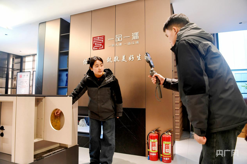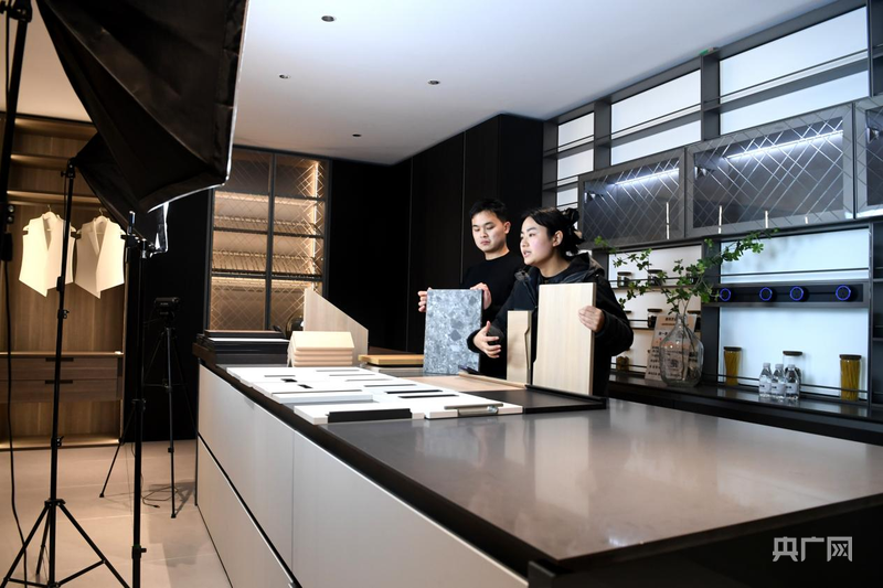 依诗米家居主播正在介绍板材(央广网记者 王艺霖 摄)