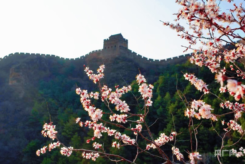 杏花的粉白花瓣映衬着雄伟长城(央广网记者 张润 摄)