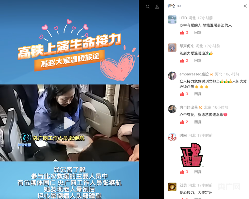 这场暖心救援被网友拍下,随后被定州融媒、北京铁路等关注并发布。一时间,“心中有爱的人总能温暖身边的人”“众人接力危急时刻显担当,人间大爱必须点赞”等温情评论,充满屏幕。