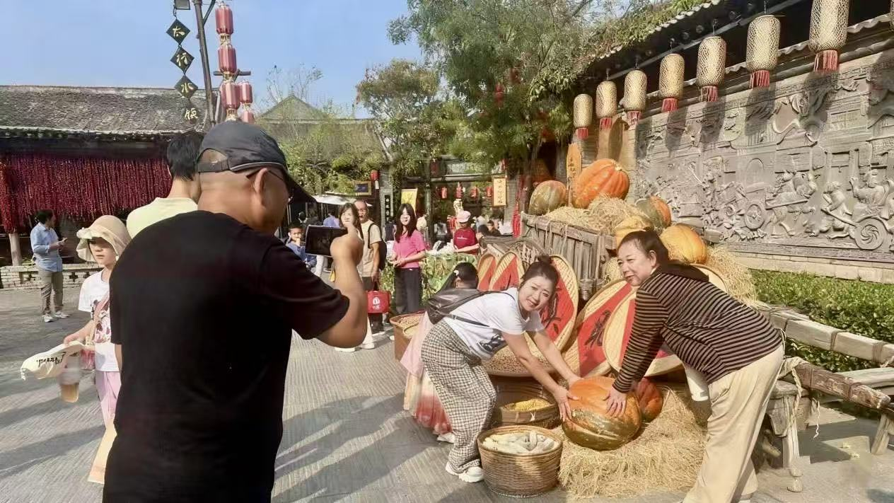 游客在易县恋乡·太行水镇拍照留念(杨希晨 摄)