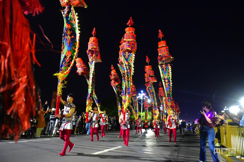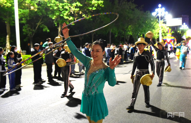 夜幕下,千余名演员组成的杂技小丑、国术武韵、非遗民俗、东方国潮等特色巡演连成流光长龙,穿梭缓行于解放西路、迎宾大道等路段。巡游队伍一路行进,一路精彩,整座城市为之沸腾。