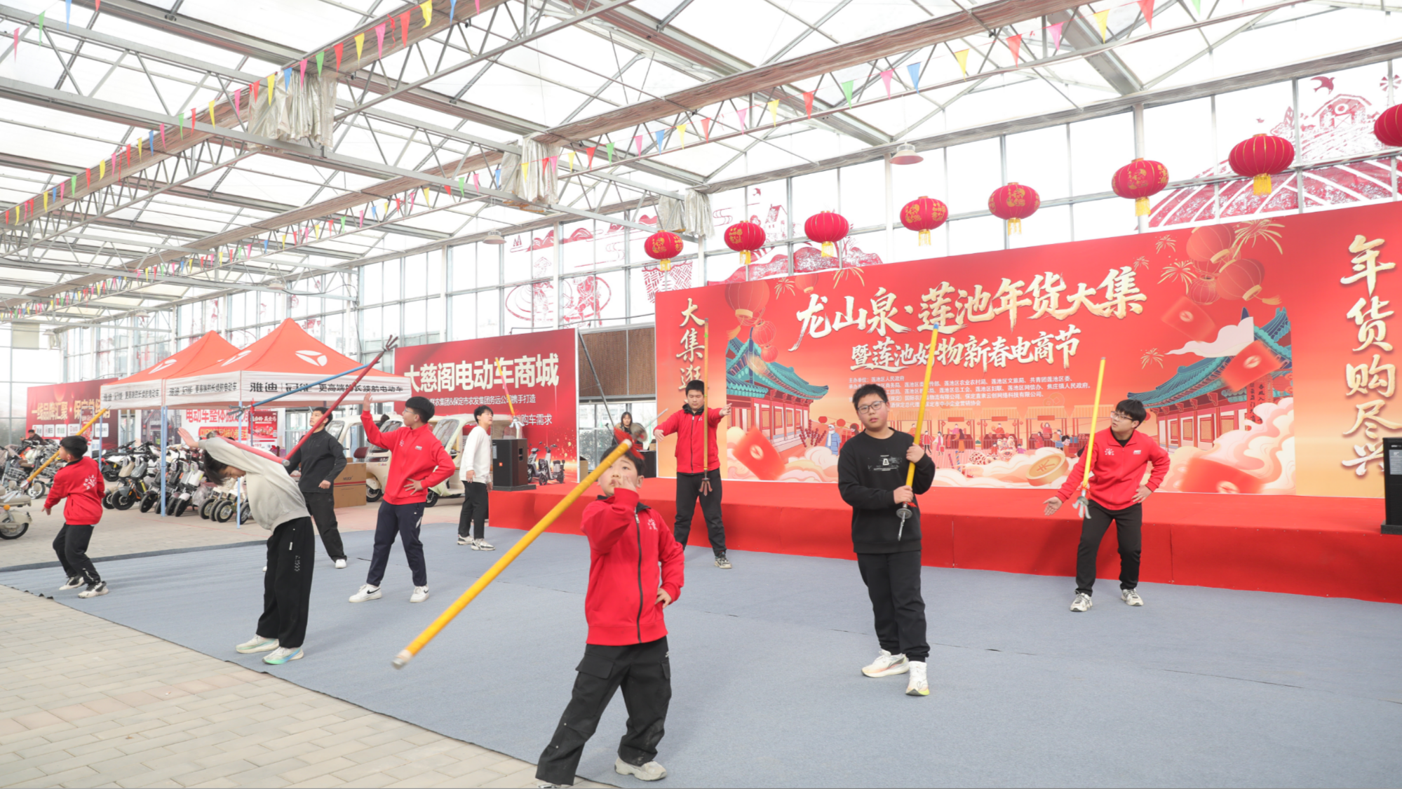“咚咚锵!咚咚锵!”2月5日,河北保定莲池区一处农国际农产品物流园内锣鼓喧天,两只色彩鲜艳的醒狮欢腾扭动、点头致意,围观市民的欢呼声此起彼伏。龙山泉·莲池年货大集暨莲池好物新春电商节正式开市,4000平米的超大集市大厅里,200余个展位一字排开,商家叫卖声、乐器演奏声、市民笑语声交织在一起,浓浓的年味扑面而来。