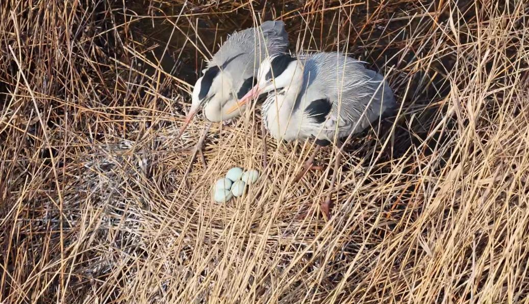 在南大港湿地边缘,苍鹭“夫妻”正在枯黄的芦苇茬间精心构筑巢穴,巢中几枚淡青色的卵犹如温润的玉石。浅滩上,灰雁与苍鹭比邻而居,有的在踱步“巡视”领地,有的在加固“房檐”,不同种类的鸟儿在这片丰饶的土地上达成了和谐共生的默契。