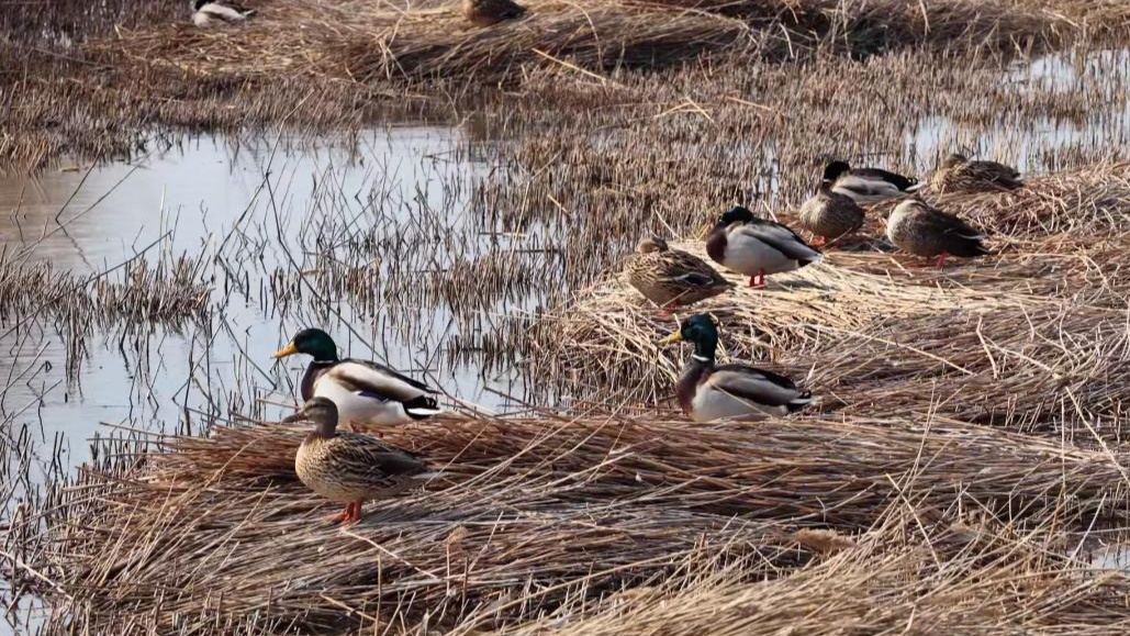 湿地的水面上也热闹非凡。绿头鸭成双成对栖息在倒伏的芦苇垫上,雄鸭翠绿鲜亮的头羽在阳光下熠熠生辉,它们或梳理羽毛,或警觉地守护着身边的“伴侣”。在视线更为开阔的芦苇墩上,普通鸬鹚则展现出了“聚居”的壮观场景,它们在较高的芦苇台上筑起一座座密集的巢穴,展现出旺盛的家族生命力。