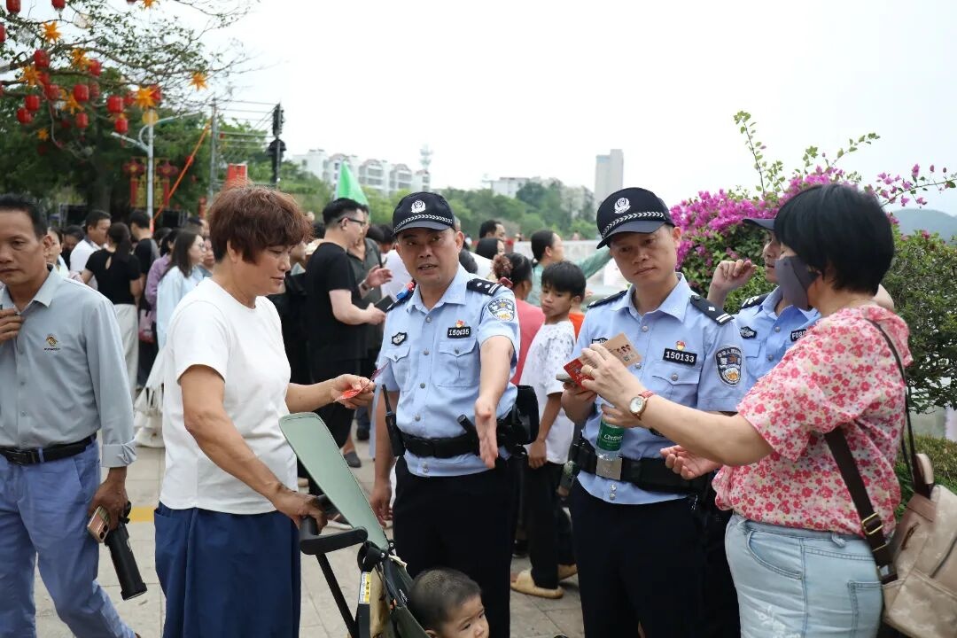 活动期间,白沙公安累计投入警力960人次、警车35辆次,服务群众四万余人次,全程坚守安保一线、精准防控。丰收祭典巡游沿线,24个执勤岗组百余名民辅警提前到岗到位,规范设置警戒带,维护现场秩序,保障巡游队伍安全顺畅通过;长桌宴举办期间,执勤警力对河畔人行桥适时采取封闭管控措施,严防拥挤踩踏、落水等安全事故发生;竹竿舞大赛、特色产品展销等活动现场,民辅警全程值守,密切关注现场动态,及时处置各类突发情况,确保各项活动有序开展。