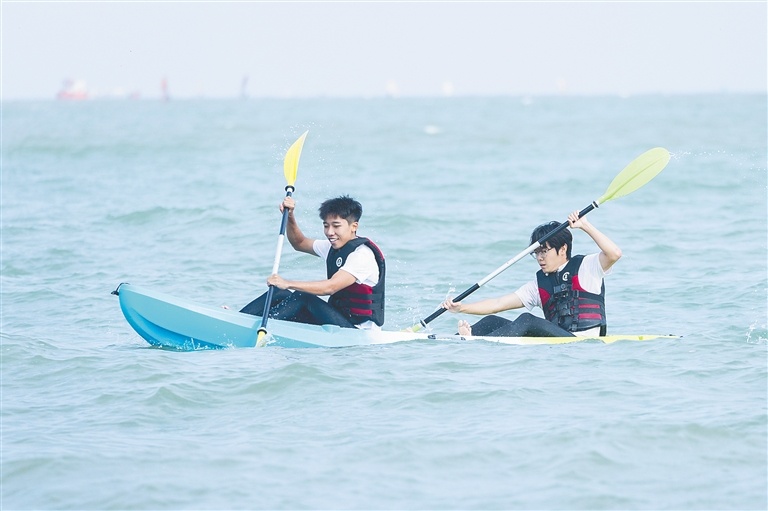 据介绍,此次海上赛事的参赛选手以男生为主,但女生同样表现出色。来自海南大学天工书院的两名女生搭档,在皮划艇竞技中表现突出,成为海上一道独特的风景线。