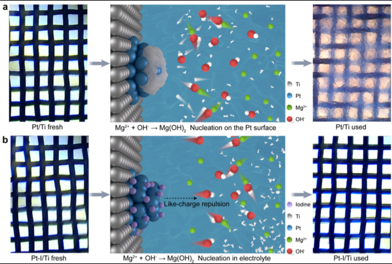一直以来,电解淡水制氢成本高、资源消耗大。相比较淡水,丰富的海水是理想的制氢原料,但其中富含的镁离子在电解过程中易在电极表面沉积,导致电极快速失效。