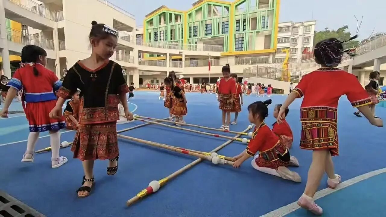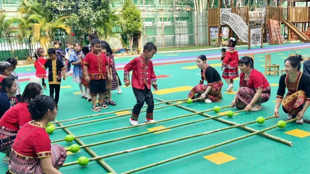 陵水黎族自治县本号镇中心幼儿园开展“三月三黎族文化月”特色庆祝活动——师幼同跳竹竿舞。