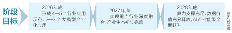 《行动方案》设定清晰阶段目标:2026年底形成4—5个行业应用示范、2—3个大模型产业化应用;2027年底实现重点行业深度融合、产业生态初步完善;2028年底算力支撑充足、数据价值充分释放,AI产业能级全面跃升。