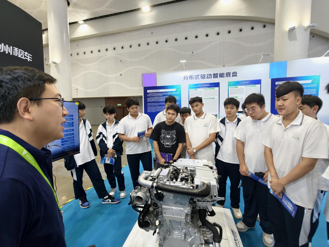 学校组织学生参观2025世界新能源汽车大会技术及科普展,他们正专注聆听讲解员对最新新能源汽车技术的讲解,深入了解行业前沿动态。人民网 符泽民 摄
