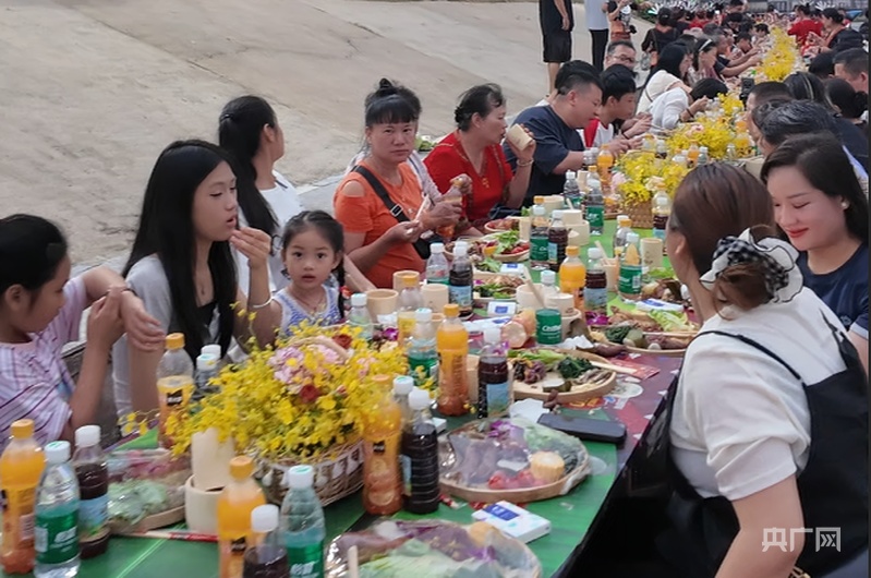 傍晚,白沙县城滨河南路、滨河北路灯火通明,长桌宴暨浪漫黎苗情歌会如期上演。长长的木桌整齐排列,黎家米酒、特色菜肴香气扑鼻,白沙黎族合唱团60名成员、各乡镇对歌队伍与游客共同唱响《欢迎你到白沙来》《朋友来喝酒》等歌曲。乡镇对歌比赛中,各队伍依次登台,用歌声传递民族情怀;黎苗婚礼仪展示还原了传统婚嫁习俗,让游客直观感受黎苗文化的魅力,现场掌声不断。