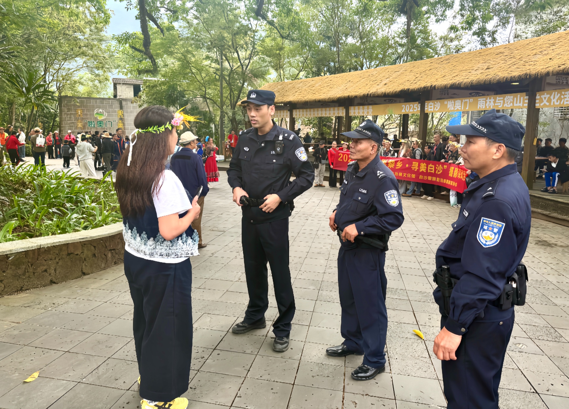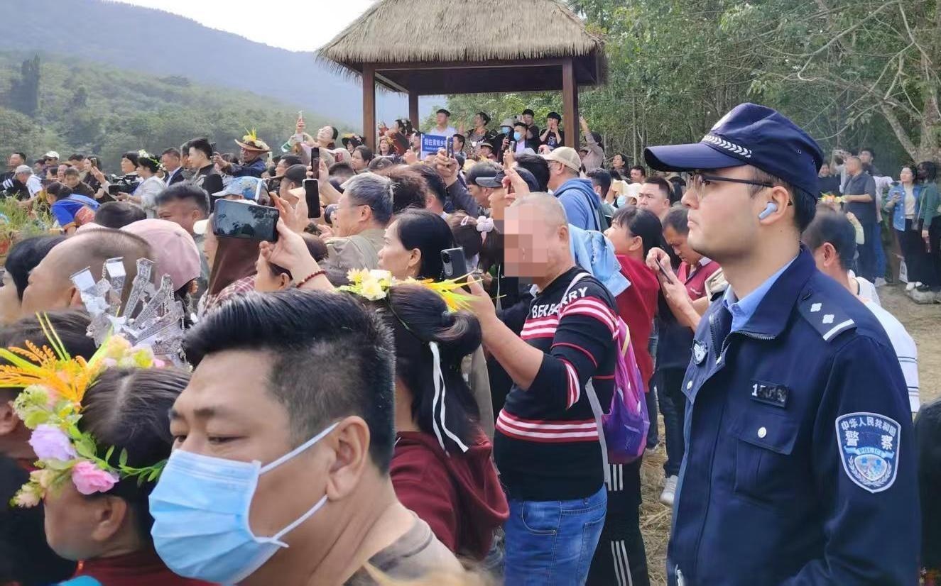 在青松乡拥处村古树广场,祈福祭祀活动即将开始。青松派出所所长曹继伟带领警员,沿着广场周边巡逻,仔细检查现场设施安全。“广场周边树木密集,我们重点关注人流疏导和消防安全,每15分钟巡查一次重点区域。”曹继伟说。不远处的赶山活动现场,2名民警身着便服融入队伍,随游客一同穿行于雨林间,实时维护秩序。“赶山路线长约3公里,我们提前清理了沿途障碍物,在陡坡、弯道处安排专人值守,防止游客滑倒或走失。”负责该环节安保的组长张涛介绍,活动全程未出现任何意外情况。