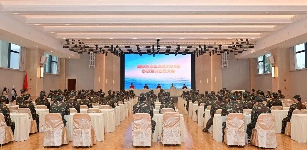 12月10日上午,奥运村报告厅内庄重热闹,国家游泳集训队2025年冬训军训动员大会在此举行。100余名身着统一迷彩服的运动员与教练员整齐就座。国家体育总局游泳运动管理中心主任、党委书记黄玮作动员部署,潘展乐、张雨霏以及教练员做冬训前的宣誓。