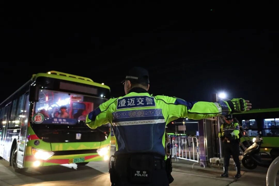 针对跨年夜车流、人流集中的特点,澄迈警方制定专项交通疏导方案,在周边重点路段、路口部署充足警力,加强现场指挥调度,根据实时车流情况灵活实施临时交通管制。执勤交警身着荧光绿制服坚守岗位,通过分段管控、实时调度等方式,耐心开展“车辆绕行指引”“有序停放劝导”等工作,用一句句提醒、一次次挥手,在街头路口筑起流动的“安全护栏”,全力保障道路畅通和群众出行平安。
